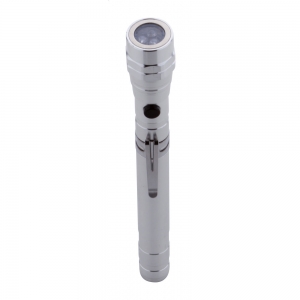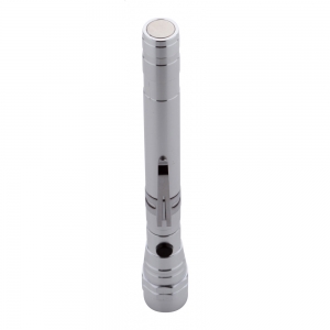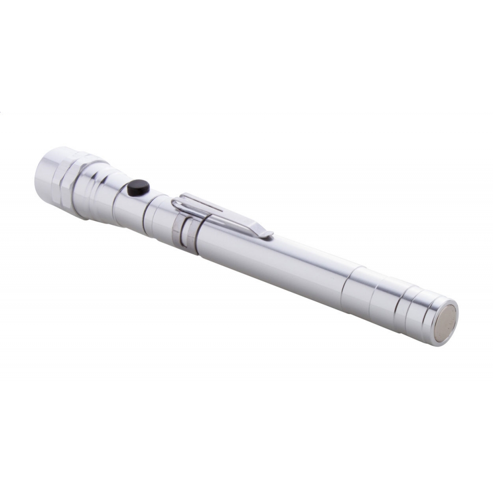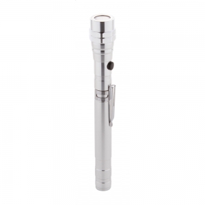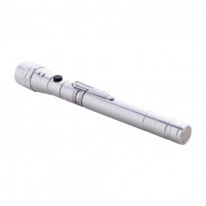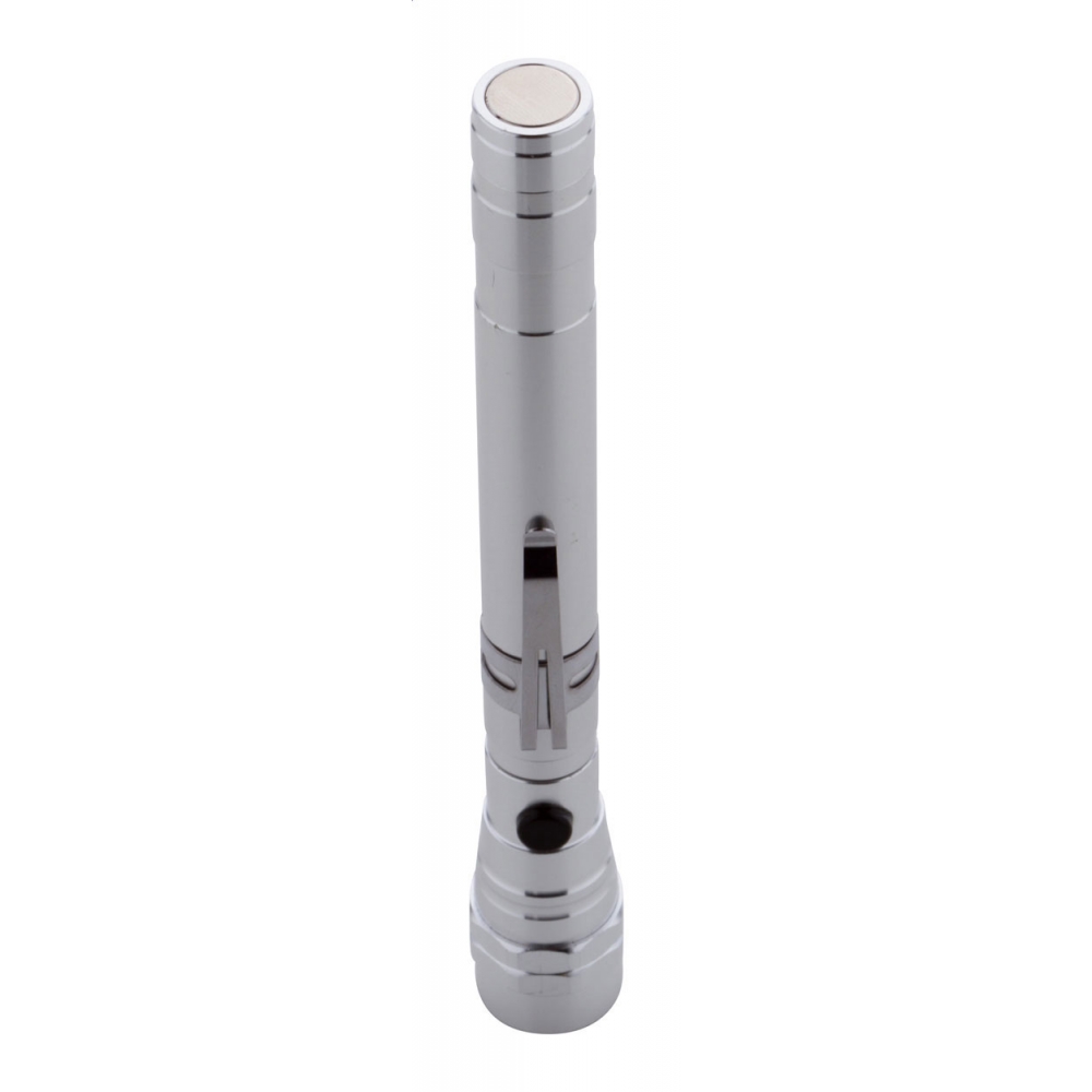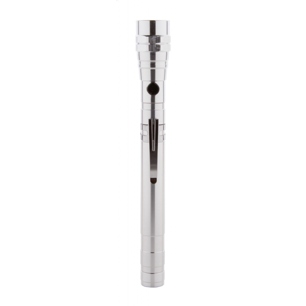 Artikel-Nr: AND844050-21Aluminium-Taschenlampe mit 3 LED's, ausziehbarem und flexiblem Kopf, Magnet an der Oberseite und seitlichem Metallclip. Inklusive Knopfzellenbatterien. Max. Länge: 57 cm.