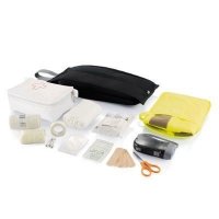 24 tlg. Erste Hilfe Set, Dynamo Taschenlampe und Warnweste (CE geprüft), konfektioniert im 600D Nylonetui. Farbe: schwarz Maße (cm): 34,5 x 16,5 x 6,2 Gewicht (g): 644 Druckfläche (mm): 50 x 180