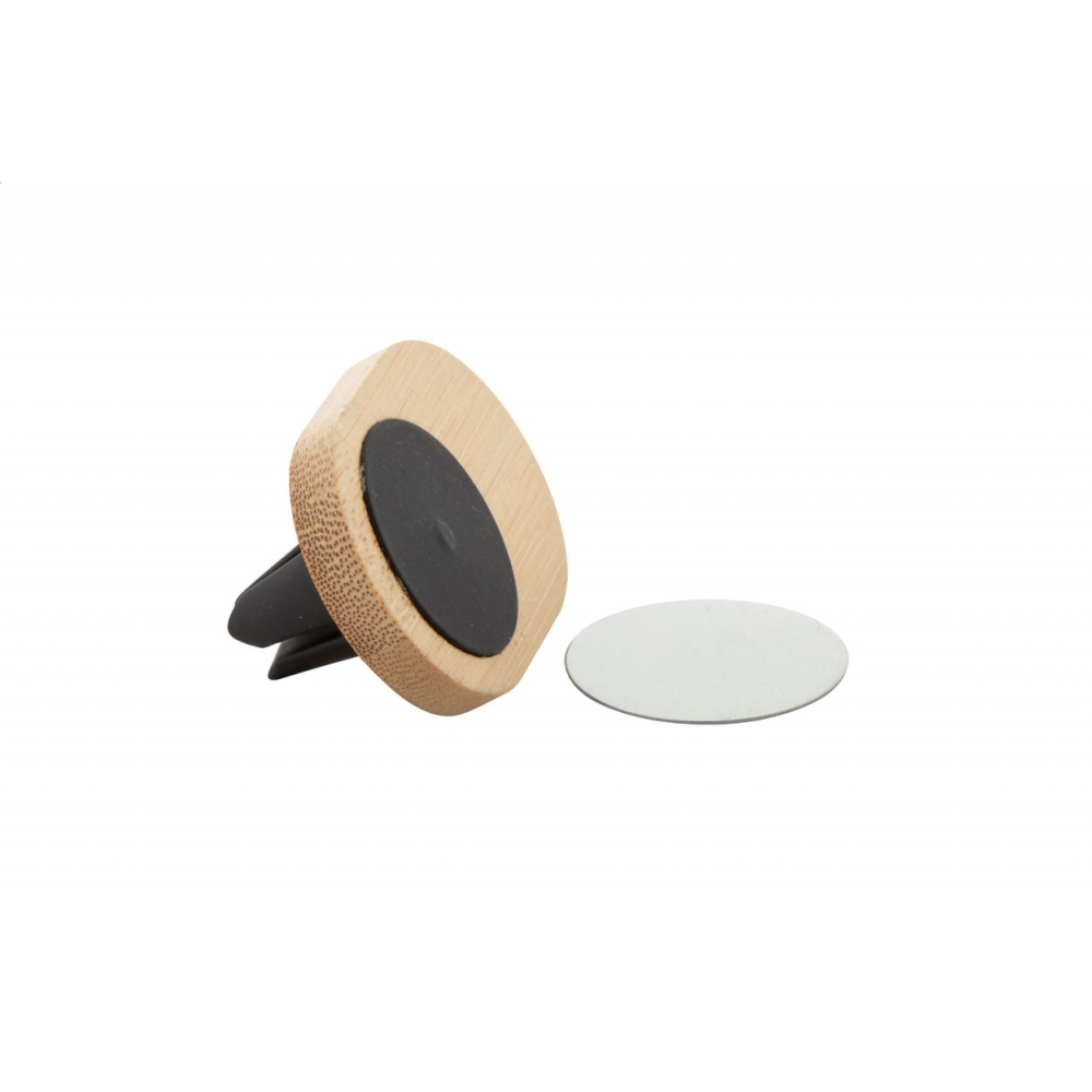 Artikel-Nr: AND808063Magnetische Auto-Handyhalterung aus Bambus mit Lüftungsschlitzbefestigung. Inklusive selbstklebender Metallplatte. In Kraftpapierbox.