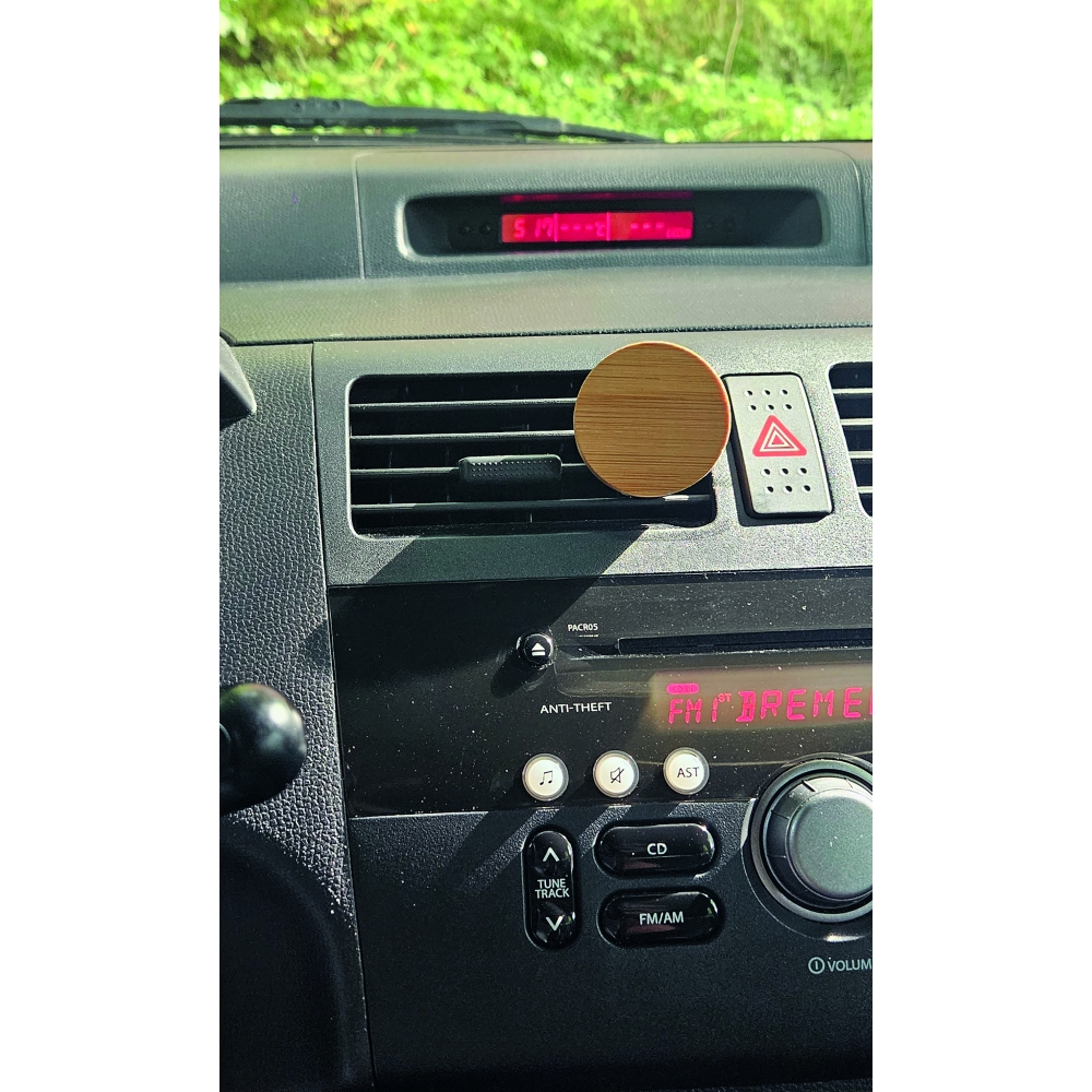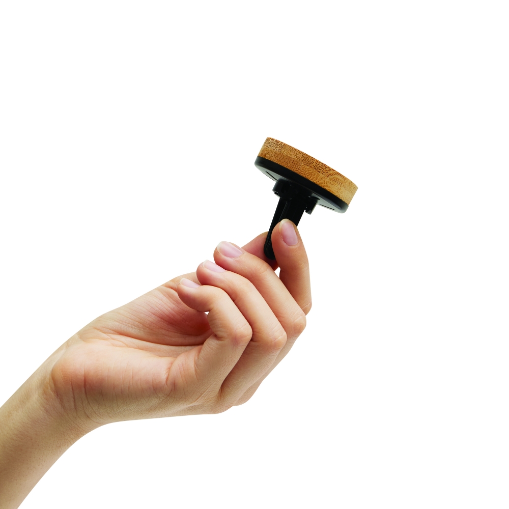 Artikel-Nr: INP56-0499006Autoduft HAZE mit Clip: einfaches Anbringen des Lufterfrischers an den Lüftungsschlitzen im Auto (für verschiedene Lamellenstärken), Silikonring mit Lemonduft, aus Bambus und Kunststoff