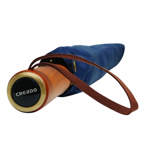 Artikel-Nr: INP56-0103420Automatik-Stockschirm POLKA: schwarzer Metallstock, Fiberglasspeichen und Metalltips, gerader Holzgriff mit messingfarbener Automatik-Auslösetaste, Griff mit "CREADO"-Doming, hochwertige Polyester-Pongee-Bespannung und -Hülle, Schließband mit Druckknopf