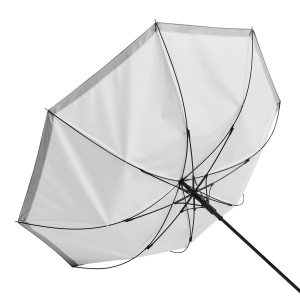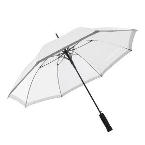 Artikel-Nr: INP56-0103522Automatischer Stockschirm CALIMA: Metallstock, Fiberglasspeichen, Metalltips, EVA-Griff, Polyester-Pongee-Bespannung aus recycelten Kunststoffen / RPET, mit silberfarbener, reflektierender Umrandung, Schließband mit Klettverschluss