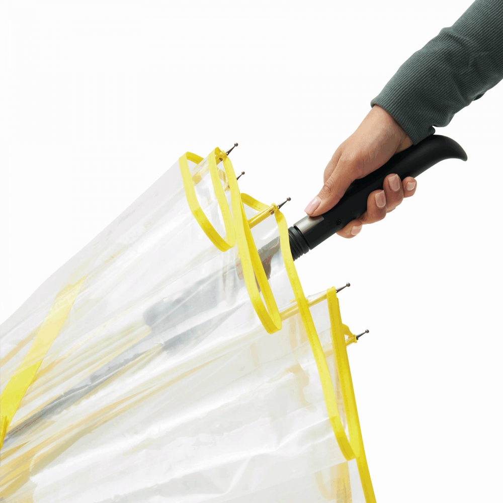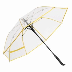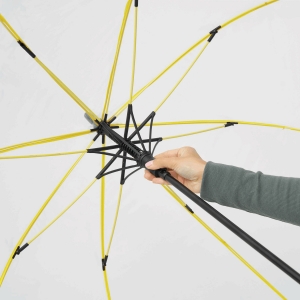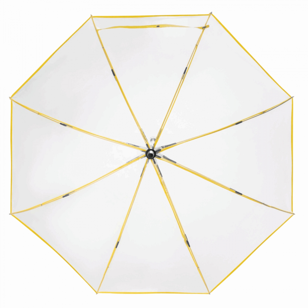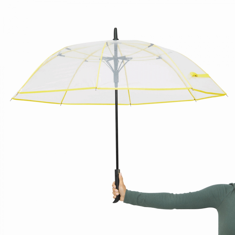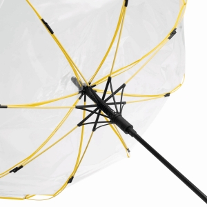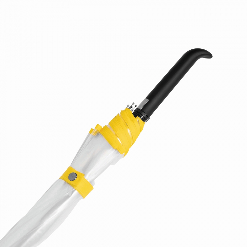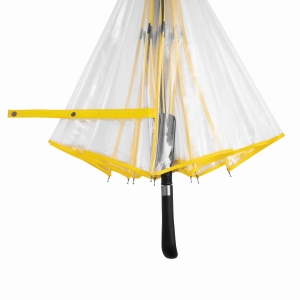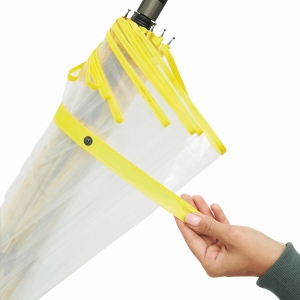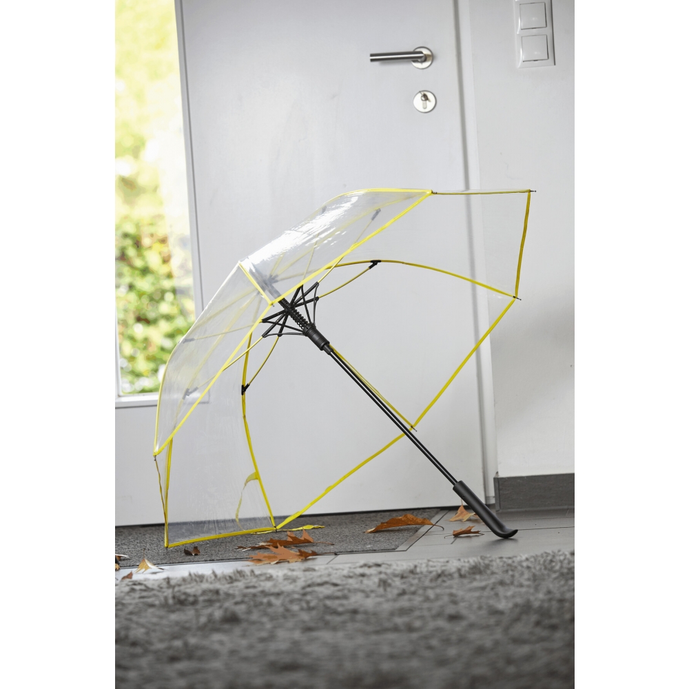 Artikel-Nr: INP56-0103404Automatischer Windproof-Stockschirm VIP: Metallstock, farbige Fiberglasspeichen mit Metalltips, Kunststoffspitze, Kunststoffgriff mit integrierter Auslösetaste, transparente POE-Bespannung mit farbiger Paspelierung, Schließband mit Druckknopf