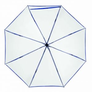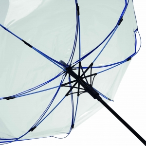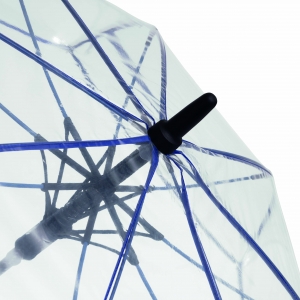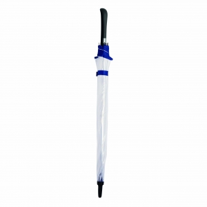 Artikel-Nr: INP56-0103400Automatischer Windproof-Stockschirm VIP: Metallstock, farbige Fiberglasspeichen mit Metalltips, Kunststoffspitze, Kunststoffgriff mit integrierter Auslösetaste, transparente POE-Bespannung mit farbiger Paspelierung, Schließband mit Druckknopf