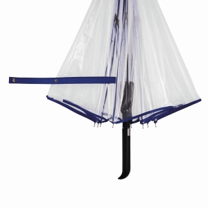 Artikel-Nr: INP56-0103400Automatischer Windproof-Stockschirm VIP: Metallstock, farbige Fiberglasspeichen mit Metalltips, Kunststoffspitze, Kunststoffgriff mit integrierter Auslösetaste, transparente POE-Bespannung mit farbiger Paspelierung, Schließband mit Druckknopf