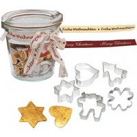 Inhalt: Weckglas (290 ml) mit 5 Ausstechern (Baum, Herz, Stern, Elch, Kleeblatt) und einer Schleife, wahlweise mit dem Aufdruck 'Frohe Weihnachten' oder 'Merry Christmas‘.