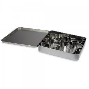 Artikel-Nr: HOP23.49624.00Dieses Set regt zum abwechslungsreichen Backen an. Geliefert wird die silberne Dose mit vier verschiedenen Ausstechförmchen. Die Backförmchen sind aus Edelstahl und spülmaschinenfest. Der Deckel ist komplett individuell im Digitaldruck bedruckbar.