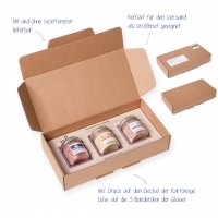 Artikel-Nr: 4941050-SEin fruchtig-süßer Traum: Knackig-frische Erdbeeren oder Kirschen, sonnenverwöhnte saftige Orangen und feinscharfer würziger Ingwer, pflückfrische Himbeeren oder Blaubeeren und fruchtig-süß-säuerliche Ananas mit einem Hauch reifer Orange, verfeinert mit erlesenen Gewürzen wie Bourbon-Vanille und Zimt und bestem Rohrohrzucker versüßen den Start in den Tag. Ihr besonderes Aroma erhalten die Zuckerle durch ein spezielles aromaschonendes Verfahren, in dem feinster Rohrohrzucker zusammen mit den Früchten bzw. Beeren und Gewürzen in der sanften Wärme des Backofens über viele Stunden geröstet wird. So verbinden sich auf natürliche Weise zweierlei Komponenten zu einem unvergleichlich köstlichen Geschmackserlebnis. Je nach Vorliebe können die Zuckerle in Joghurt, auf Frischkäse, in Müsli, Milch & Co. genossen werden. Als günstiges und leckeres Give-away bei Promotion-Aktionen, Werbe- und Messeauftritten oder als sympathisches Präsent für den Außendienstmitarbeiter ist das Miniglas die perfekte Wahl. Die Banderole des Glases ist individuell gestaltbar, Kreativität und Fantasie sind dabei keine Grenzen gesetzt.