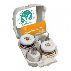 Artikel-Nr: HOP23.49681.00Das Backset mit Herz bringt frühlingshafte Freude in Ihre Osterbäckerei. Dieses sorgfältig zusammengestellte Set macht nicht nur das Backen zu einem Vergnügen, sondern sorgt auch für extra Osterfreude. In der hübschen Kartonverpackung befinden sich zwei Backförmchen in Herzform in verschiedenen Größen, ideal für die Zubereitung von leckerem Ostergebäck. Ein kleiner Rezeptflyer mit zwei Backrezepten ist ebenfalls enthalten. Zusätzlich umfasst das Set zwei Gläschen feiner Konfitüre in den Geschmacksrichtungen Erdbeere und Orange. Die quadratische Box aus hochwertigem Recyclingkarton wird einem individuellen Werbeaufkleber auf der Außen- oder Innenseite personalisiert werden.