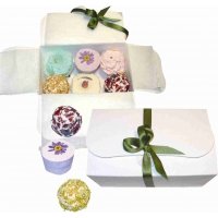 Inhalt: Weiße Geschenkpackung mit 6 Bade-Pralinen sortiert: 1 Shea-Butter Blütentrüffel, 1 Kakao-Butter echte Rose, 2 Shea-Butter mit lila Blüte, 2 Kakao-Butter Törtchen.