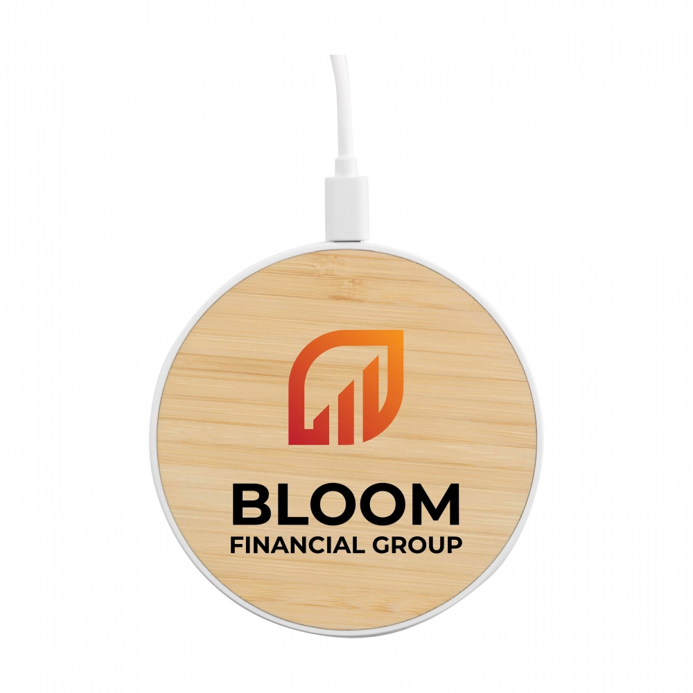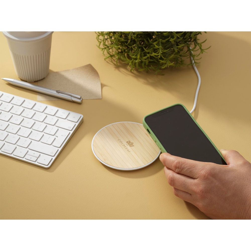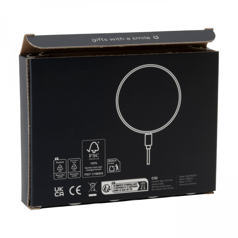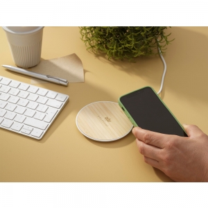 Artikel-Nr: CLP262988-002Kabelloses 15-W-Schnellladegerät aus ABS und FSC 100% zertifiziertem Bambus. Zum schnellen kabellosen Laden von Mobiltelefonen. Kompatibel mit allen mobilen Geräten, die das drahtlose QI-Laden unterstützen (Androids und iPhones der neuesten Generation). Eingang: 9V/2A. Drahtloser Ausgang: 5V/10W. Inklusive USB-C-Ladekabel und Gebrauchsanweisung.