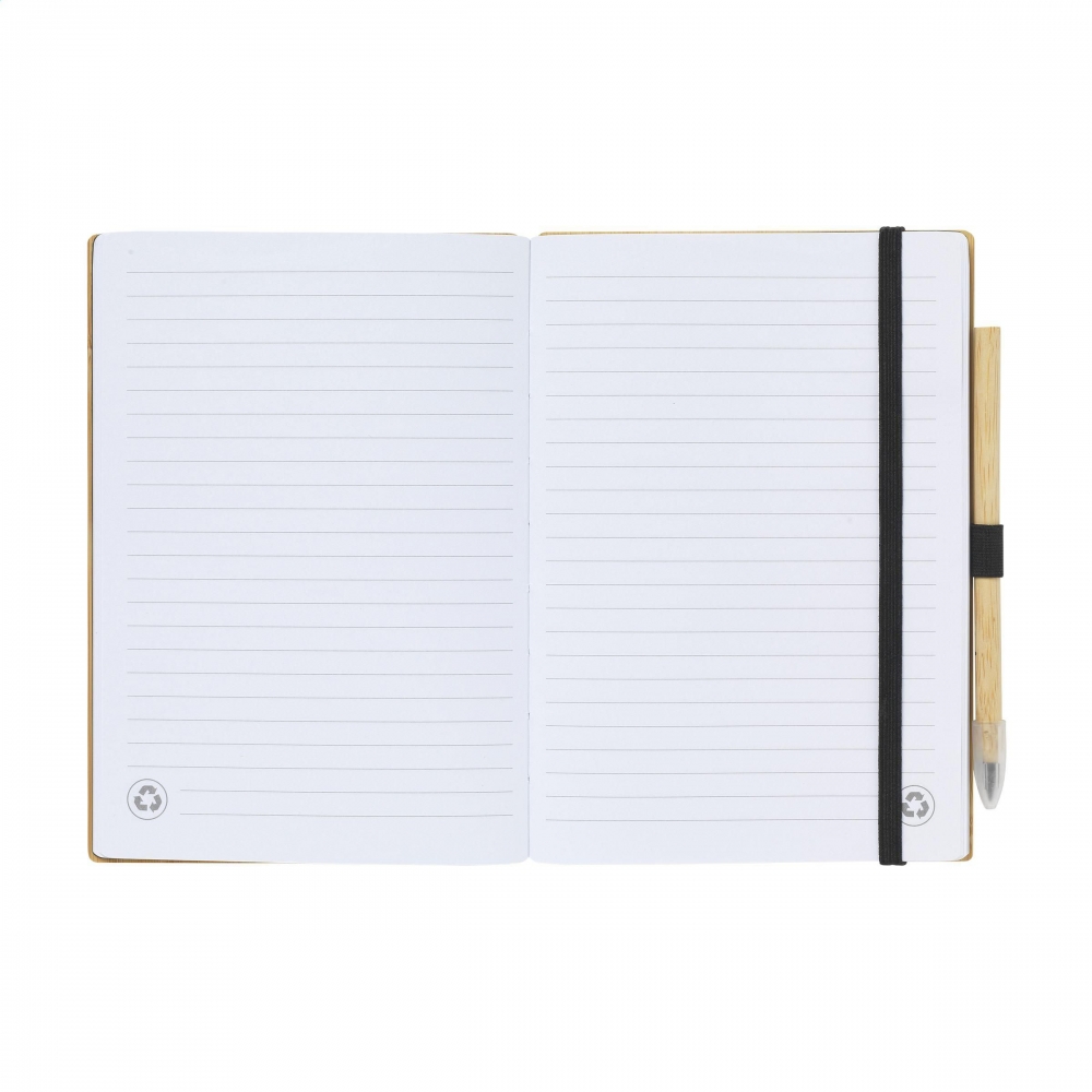 Artikel-Nr: CLP263891-823Notizbuch im A5-Format mit stabilem, FSC Mix zertifiziertem Bambus-Hardcover, praktischer Stiftschlaufe und Verschlussgummi. Das Notizbuch umfasst ca. 80 Blatt/160 Seiten weißes, liniertes, recyceltes FSC Mix zertifiziertes Papier (80 g/m²). Dieses Notizbuch wird mit einem Bambus-Bleistift mit Kappe geliefert. Dieser Bleistift hat eine Graphitspitze mit einer Schreiblänge von bis zu ca. 20.000 Metern. Er schreibt wie ein herkömmlicher Bleistift und kann ausradiert werden. Die Spitze muss nicht angespitzt werden und nutzt sich sehr langsam ab. Dadurch hält der Stift bis zu 100 Mal länger als ein herkömmlicher Bleistift. Eine perfekte Kombination, um Notizen zu erstellen.