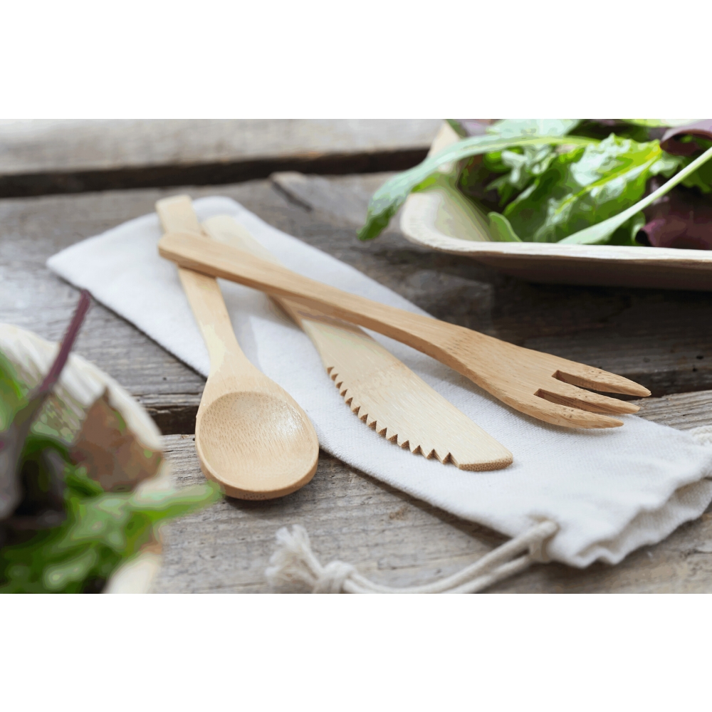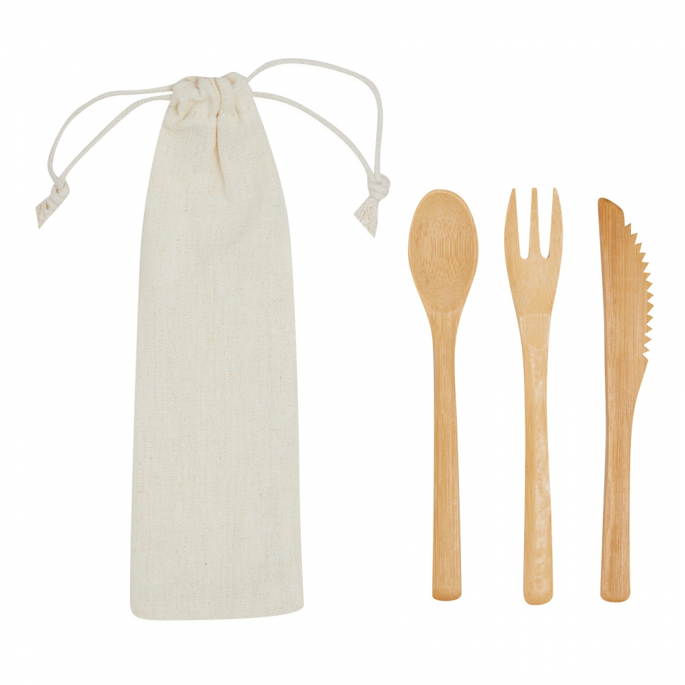 Artikel-Nr: INP56-0304415Bambus Besteckset NATURAL TRIP, im Baumwoll-Säckchen: inkl. Gabel, Messer und Löffel