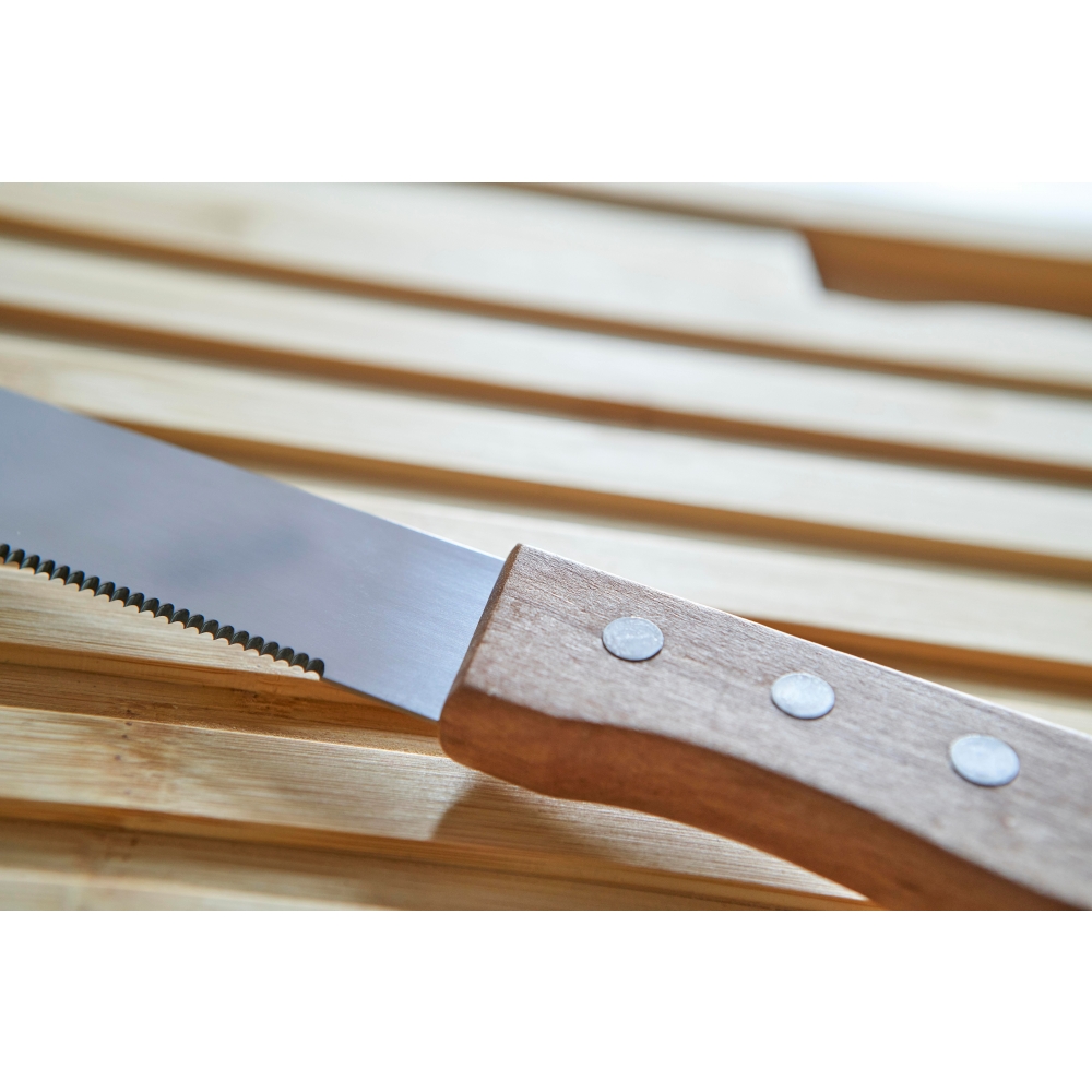 Artikel-Nr: GIV1097558011Bambus Brot-Schneidebrett. Inklusive Edelstahl-Brotmesser mit Bambusgriff. Einzeln verpackt in einem braunen Karton