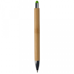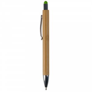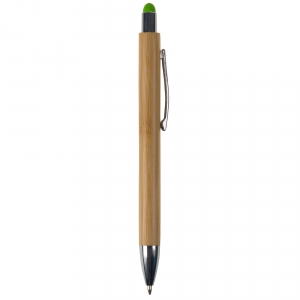 Artikel-Nr: ART87285N0031Kugelschreiber aus Bambus, inkl. metallbeschichteten Drücker und Spitze und einen Clip aus Metall. Der auf dem Drücker platzierte Touchpen, für die Bedienung von Smartphone-Displays, gibt es in sechs Farben. Inkl. einer blau schreibenden Jumbo-Mine aus Kunststoff.