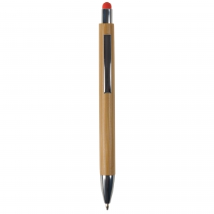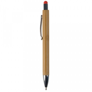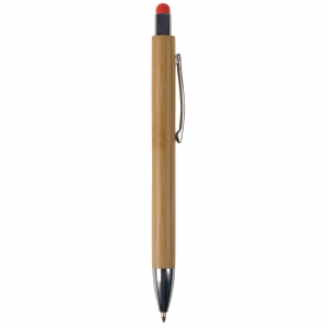 Artikel-Nr: ART87285N0026Kugelschreiber aus Bambus, inkl. metallbeschichteten Drücker und Spitze und einen Clip aus Metall. Der auf dem Drücker platzierte Touchpen, für die Bedienung von Smartphone-Displays, gibt es in sechs Farben. Inkl. einer blau schreibenden Jumbo-Mine aus Kunststoff.