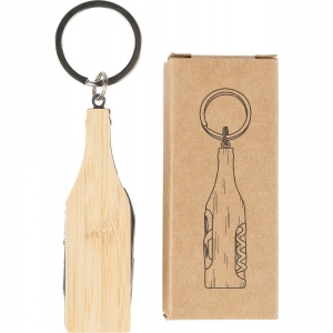 Artikel-Nr: GIV1349510011Multifunktions-Schlüsselanhänger in Flaschenform ist aus Bambus und Edelstahl gefertigt und verfügt über einen Metallring. Er verfügt über einen Korkenzieher, eine Nagelfeile, einen Flaschenöffner und eine Klinge. Er ist einzeln verpackt in einer braunen Papierbox.
