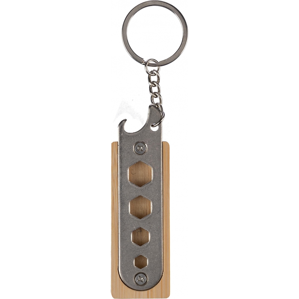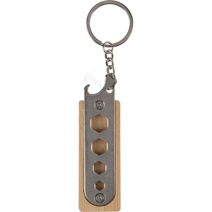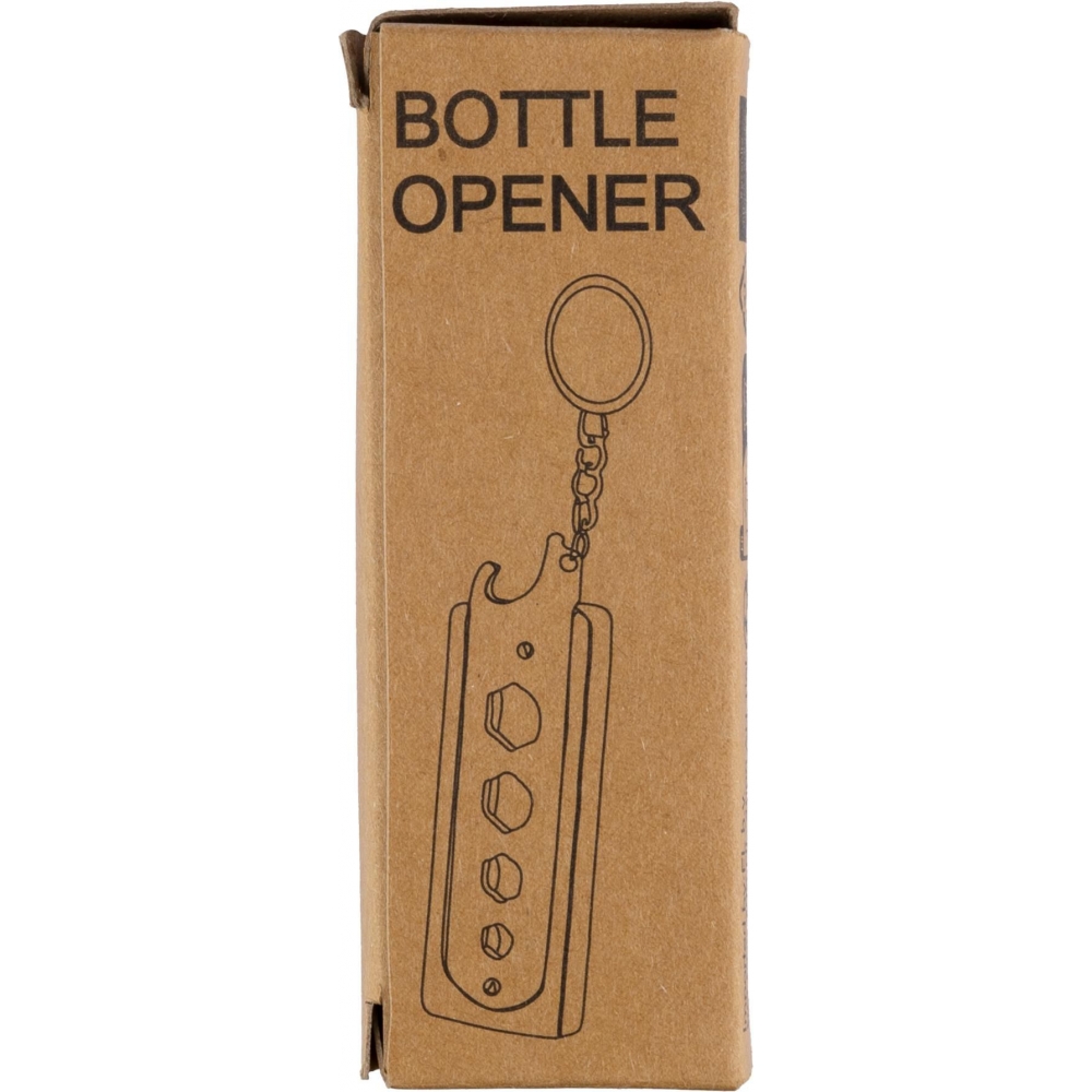 Artikel-Nr: GIV1097474011Bambus-Schlüsselhalter mit Flaschenöffner, einschließlich 4 Schraubenschlüsselwerkzeuge im Inneren. Einzeln verpackt in einem braunen Karton mit einfarbiger Zeichnung.
