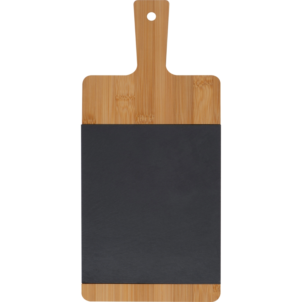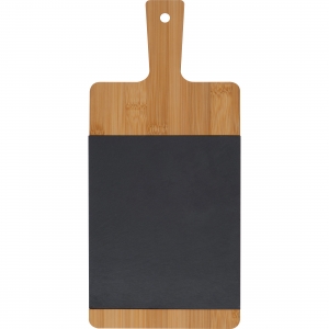 Artikel-Nr: MCM8386413Servierbrett aus Bambus mit Schieferplatte, Tragegriff und Öse zum Aufhängen. Die Werbung wird auf die Bambusfläche graviert.