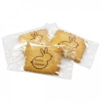Artikel-Nr: 4941080-FKLeckerer und effektiver Werbebotschafter: Ein feiner Butterkeks mit zartbuttrigem Geschmack und köstlicher Vanillenote ist aromageschützt in Klarsichtfolie eingeschweißt und zwischen eine Klappkarte geheftet. Deren Maße von 55 x 85 mm eignen sich bestens auch für großformatige Werbeaktionen, z.B. mit Gutschein. Beide Seiten können dabei 4-farbig bedruckt und individuell mit Logos, Slogans und Texten gestaltet werden. Ein mit Lebensmittelfarbe auf den Keks aufgedruckter Slogan oder ein Motiv unterstützen bzw. verstärken Ihre Werbebotschaft optimal. Sie zergeht mit dem exquisiten Geschmack des Kekses buchstäblich auf der Zunge und hinterlässt einen bleibenden Eindruck bei der Zielperson bzw. Zielgruppe.