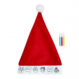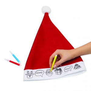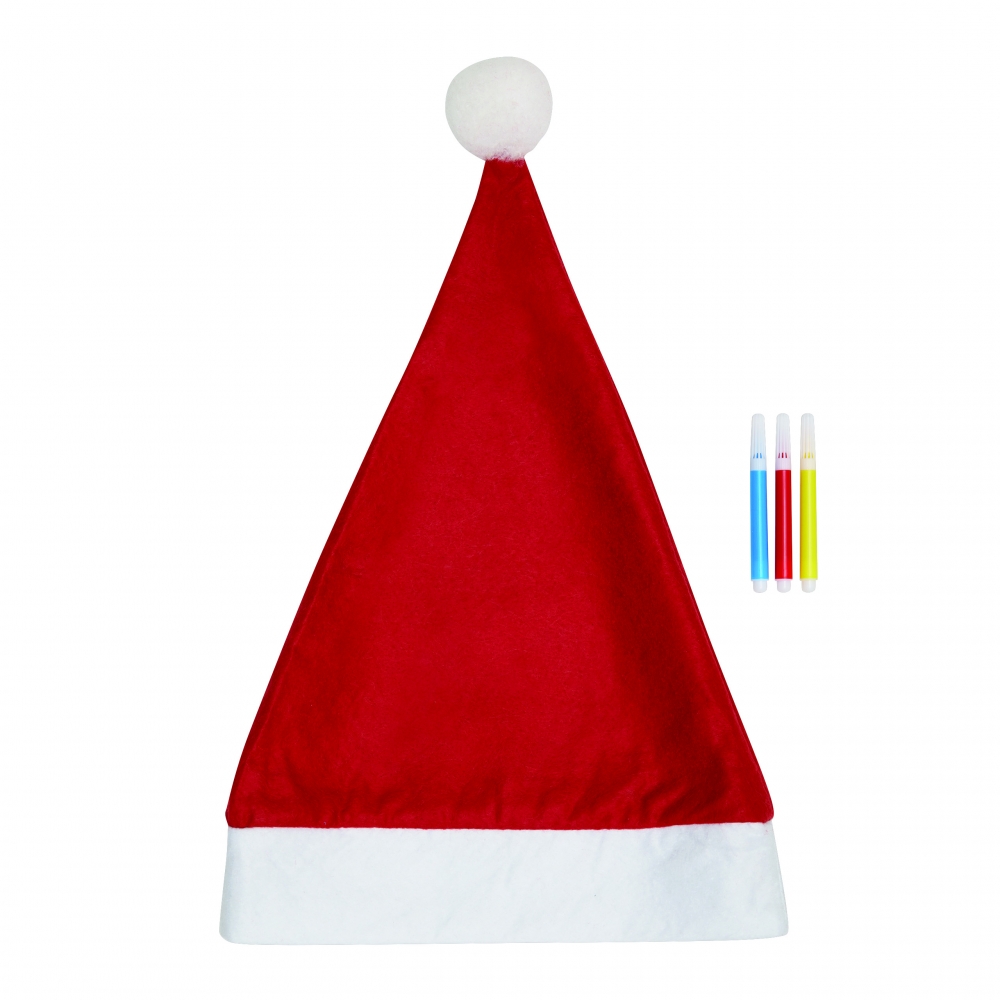 Artikel-Nr: INP56-0905025Bemalbare Filz-Weihnachtsmann-Mütze COLOURFUL HAT: mit Motiv zum Ausmalen auf der Vorderseite, inkl. 3 verschiedenfarbigen Filzstiften (gelb, rot, blau)