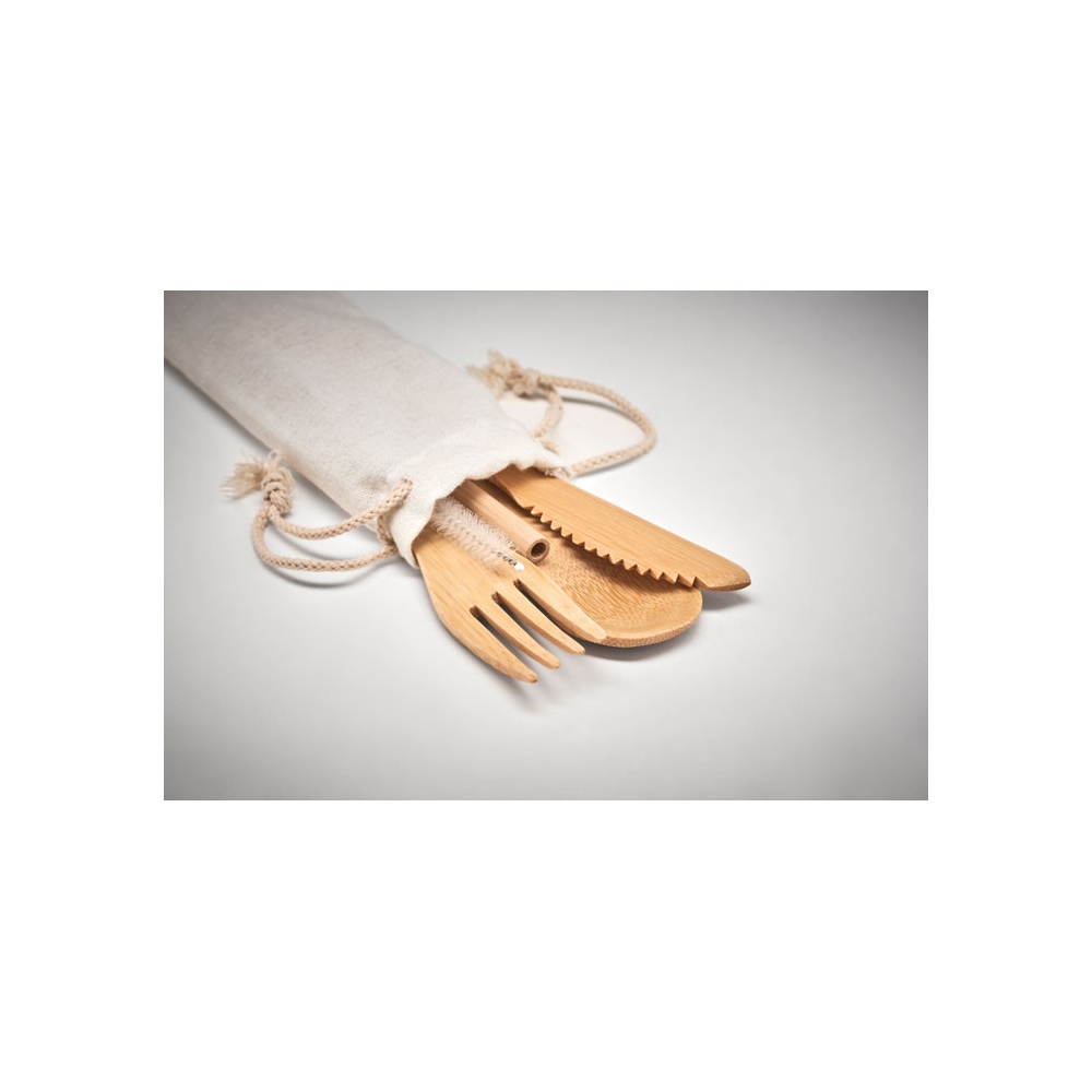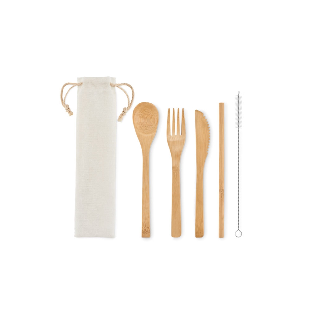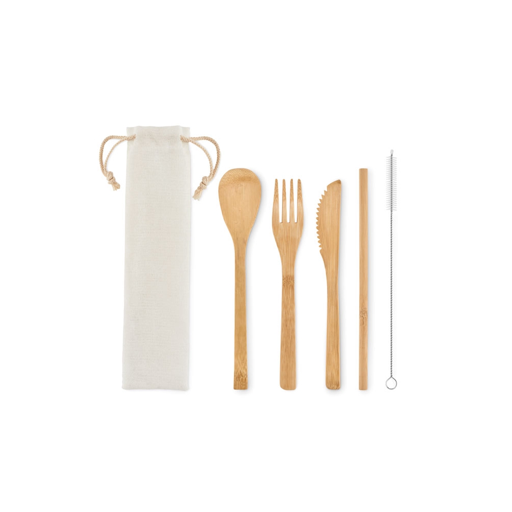 Artikel-Nr: OCBMO6121-13Wiederverwendbares Besteck-Set mit Messer, Gabel, Löffel und Trinkhalm aus Bambus sowie einer Bürste aus Edelstahl. Im Canvas-Beutel. Bambus ist ein natürliches Produkt, es kann daher zu leichten Abweichungen in Farbe, Dekor und Maßen kommen.