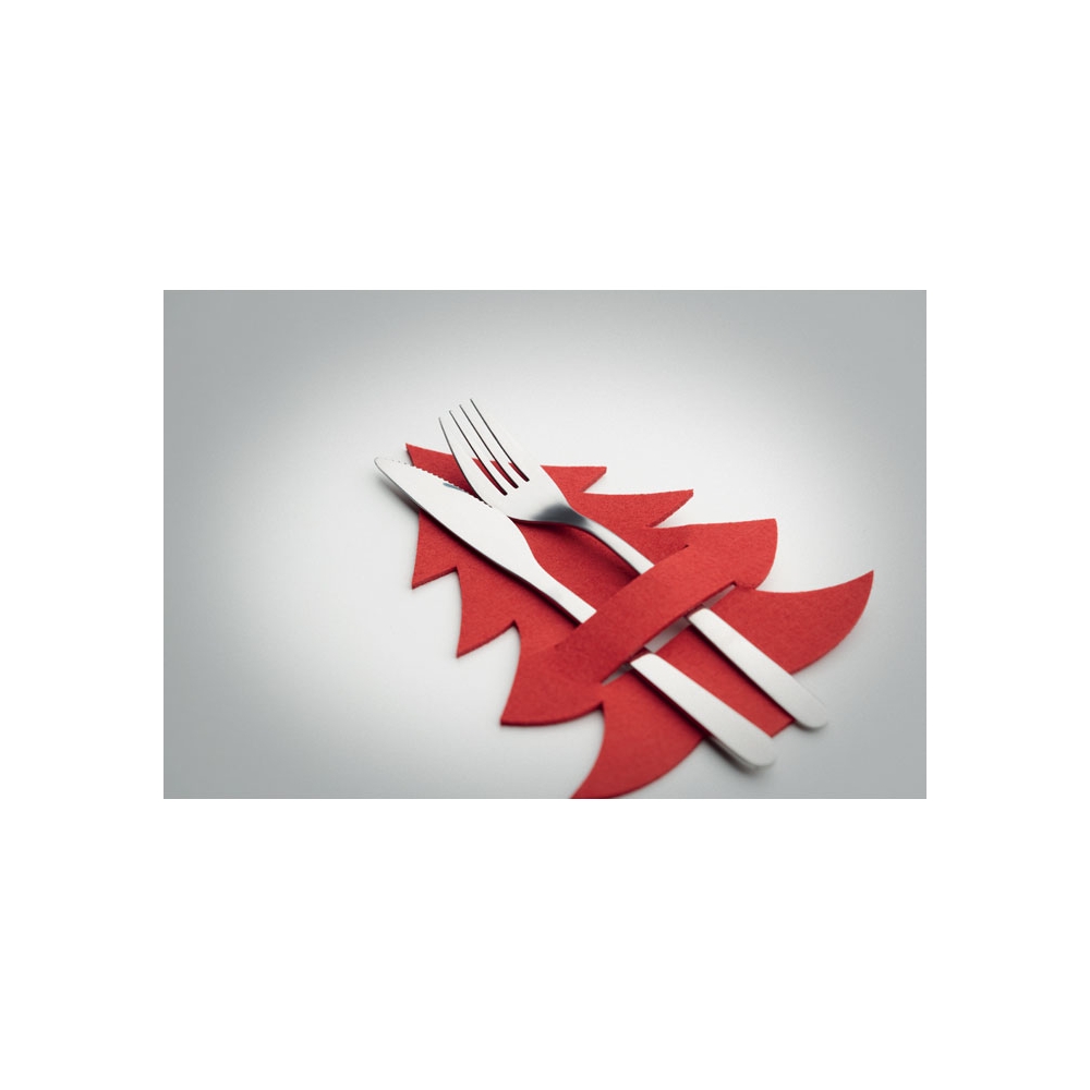 Artikel-Nr: OCBCX1479-05Set mit 4 Besteckhaltern aus RPET-Filz in Form eines Tannenbaums. Lieferung in einer Schachtel aus Kraftpapier.
