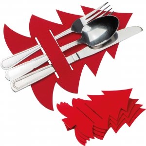 Artikel-Nr: MCM8317105Weihnachtliche Bestecktasche aus Filz in Christbaumoptik, passend für Messer, Gabel und Löffel. Ihre Werbung wird auf die Tasche gedruckt.