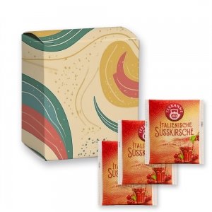 Artikel-Nr: FNM02506Faltschachtel. Werbeanbringung als Direktdruck in 4c individuell bedruckbar. Zutaten Beuteltee Italienische Süsskirsche: Hibiskus, Äpfel, Hagebutten, Süßkirsch-Aroma (6%), Süßblätter, Süßkirschengranulat.
