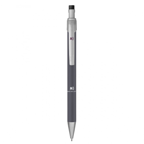 Weicher, gummierter Schaft. Als Kugelschreiber und Bleistift erhältlich. Maße: 1,3 cm B X 13,5 cm H Material: PP Kunststoff, Aluminium, Aluminium, Aluminium, Stahl