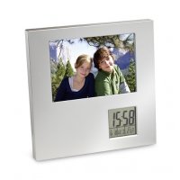 Artikel-Nr: 34250649Gute Laune für Ihren Schreibtisch! Bilderrahmen aus Aluminium mit Platz für ein 13x9 cm großes Foto, mit Uhr, Datum, Wochentags- und Temperaturanzeige.