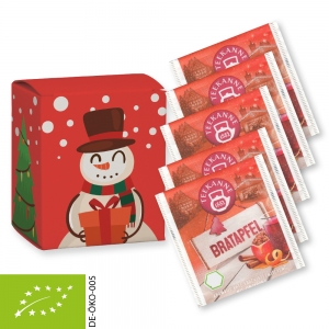 Artikel-Nr: FNM02059Faltschachtel. Werbeanbringung als Direktdruck in 4c individuell bedruckbar. Zutaten Bio Beuteltee Bratapfel: Hibiskus*, Äpfel*, süsse Brombeerblätter*, Zimt*, natürliches Zimtaroma*, Süssholz*, Süssblätter*, Orangenschalen*. *aus kontrolliert biologischem Anbau.