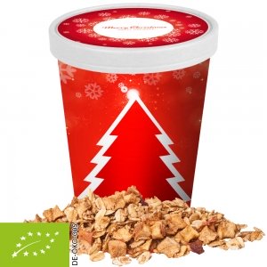 Artikel-Nr: FNM00471Snackbecher Maxi aus Papier. Werbeanbringung als Direktdruck in 4c individuell bedruckbar. Zutaten Bio Crunchy Weihnachtsmüsli Apfel-Zimt: Haferflocken*, Vollkorn-Weizenflocken*, Rohrohrzucker*, Apfelwürfel*, Amaranth*, Honig*, Erdnussöl*, Zimt*, Meersalz; *aus kontrolliert biologischem Anbau.