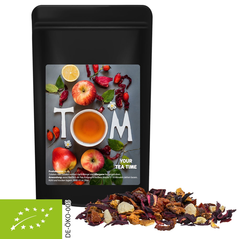 Artikel-Nr: FNM02015Standbeutel Midi schwarz. Werbeanbringung als Etikett in 4c individuell bedruckbar. Zutaten Bio Früchtetee gute Laune: Hagebuttenschalen*, Hibiskusblüten*, Apfel*, Orangenschalen*. *aus kontrolliert biologischem Anbau.