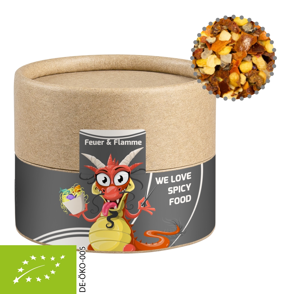 Artikel-Nr: FNM01520Kraftpapierdose Mini aus Papier. Werbeanbringung als Etikett in 4c individuell bedruckbar. Zutaten Bio Gewürzmischung Feuer und Flamme: Steinsalz, Chili*, Pfeffer*, Paprika*, Knoblauch*; *aus kontrolliert biologischem Anbau.