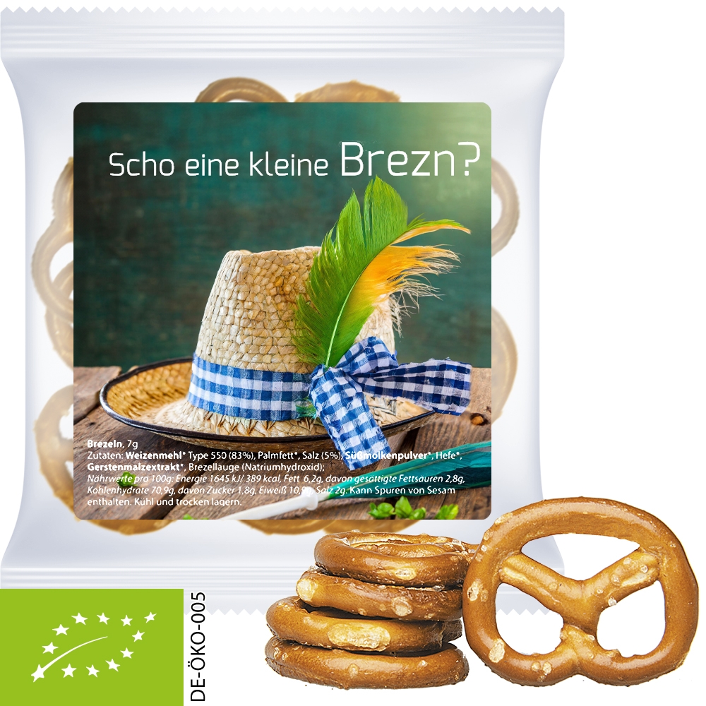 Artikel-Nr: FNM00001Maxi-Tüte aus transparenter Folie. Werbeanbringung als Etikett in 4c individuell bedruckbar. Zutaten Bio Mini Brezeln Original: Weizenmehl* (86%), Palmfett*, Salz (5%), Gerstenmalzextrakt*, Hefe*, Brezellauge (Natriumhydroxid); *aus kontrolliert biologischem Anbau. Kann Spuren von Sesam enthalten.