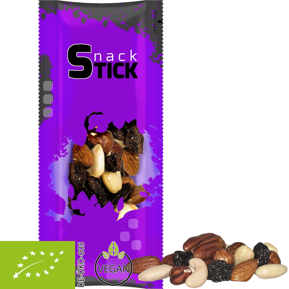 Artikel-Nr: FNM01201Snack Stick aus weißer Folie oder transparenter Folie. Werbeanbringung als Direktdruck in 4c individuell bedruckbar. Zutaten Bio Studentenfutter: Nusskernmischung* 60% (in veränderlichen Gewichtsanteilen: Haselnusskerne*, Mandeln blanchiert*, Mandeln*, Cashewkerne*, Pekannusskerne*), Rosinen* 40%; *aus kontrolliert biologischem Anbau. Kann Spuren von anderen Schalenfrüchten und Getreide enthalten. Produkt unterliegt naturgegebenen Schwankungen - trotz strenger Qualitätskontrolle können Schalen- bzw. Kernbestandteile nicht ausgeschlossen werden.
