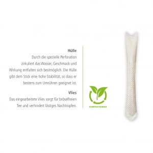 Artikel-Nr: SAN10-170-000-000Bio TeaStick (Premium Selection). • Hergestellt aus Pflanzenfasern und Stärke • Ohne Gentechnik • Vegan • Nicht erdölbasiert • Zu 100% aus nachwachsenden und natürlichen Rohstoffen • Stick biologisch abbaubar (kompostierbar) • Aromaverpackung aus Papier Einfach und unkompliziert in der Anwendung: Durch die spezielle Perforation kann das Wasser zirkulieren, Geschmack und Wirkung entfalten sich bestmöglich. Das Vlies im Inneren sorgt für bröselfreien Tee und verhindert Nachtropfen. in,, Tee, und BIO Kontrollstelle DE-ÖKO-039. Auch erhältlich mit diversen Verpackungen, als Geschenksets oder mit individuell bedruckter Aromaschutzverpackung.