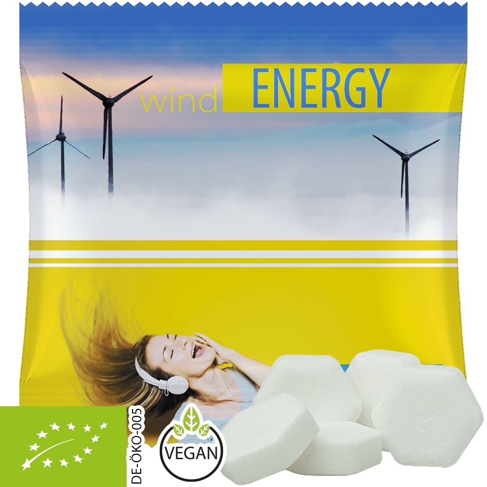Artikel-Nr: FNM00257Mini-Tüte aus weißer Folie oder optional transparenter Folie. Werbeanbringung als Direktdruck in 4c individuell bedruckbar. Zutaten Bio Traubenzucker Orange Drops: Dextrose*, Kokosfett*, Säuerungsmittel: Citronensäure; natürliches Aroma. *aus kontrolliert biologischem Anbau.