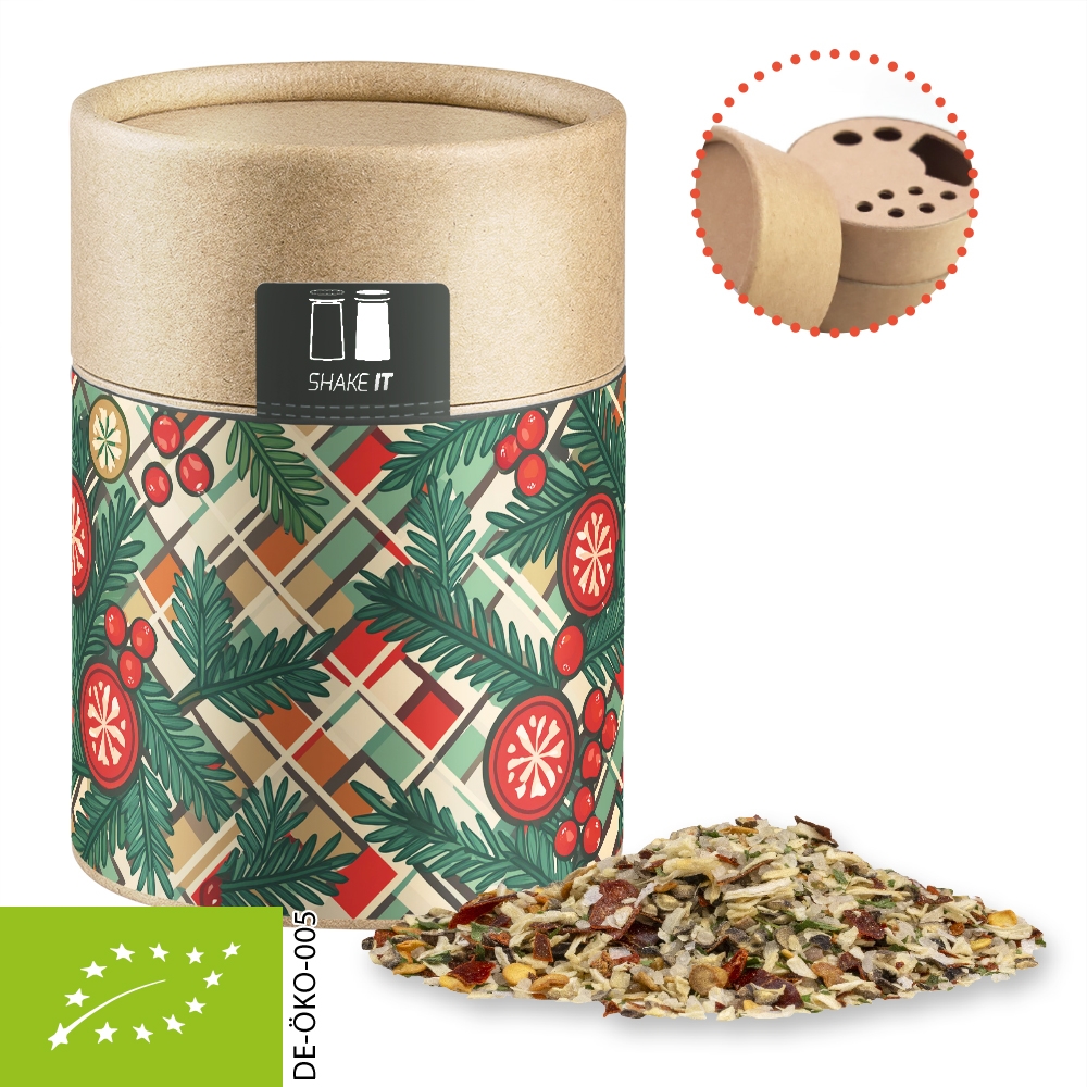Artikel-Nr: FNM02328Kraftpapierstreuer Midi aus Papier. Werbeanbringung als Etikett in 4c individuell bedruckbar. Zutaten Bio Weihnachts Gewürzmischung Braten: Meersalz, Zwiebeln*, Pfeffer*, Paprika*, Petersilie*, Chillies*. *aus kontrolliert biologischem Anbau.