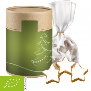 Artikel-Nr: FNM01662Beutel in Kraftpapierdose Maxi. Werbeanbringung als Etikett in 4c individuell bedruckbar. Zutaten Bio Zimtsterne: Rohrzucker*, Mandeln*, Weizenmehl*, Haselnüsse*, Glukosesirup*, Palmfett*, Honig*, Zuckerrübensirup*, Invertzuckersirup*, Weizenstärke*, Hühnertrockeneiweiß*, Hühnereieiweiß*, Vollmilchpulver*, Celyon Zimt*, Rapsöl*, Gewürze*, Maisstärke*, Backtriebmittel: Kaliumcarbonate, Natriumcarbonate; Säuerungsmittel: Milchsäure, Monokaliumtartrat; *aus kontrolliert biologischem Anbau.