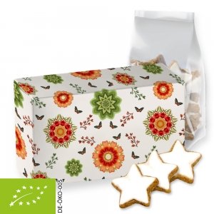 Artikel-Nr: FNM01894Faltschachtel. Werbeanbringung als Direktdruck in 4c individuell bedruckbar. Zutaten Bio Zimtsterne: Rohrzucker*, Mandeln*, Weizenmehl*, Haselnüsse*, Glukosesirup*, Palmfett*, Honig*, Zuckerrübensirup*, Invertzuckersirup*, Weizenstärke*, Hühnertrockeneiweiß*, Hühnereieiweiß*, Vollmilchpulver*, Celyon Zimt*, Rapsöl*, Gewürze*, Maisstärke*, Backtriebmittel: Kaliumcarbonate, Natriumcarbonate; Säuerungsmittel: Milchsäure, Monokaliumtartrat; *aus kontrolliert biologischem Anbau.