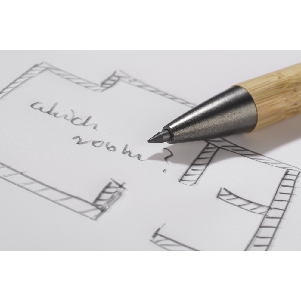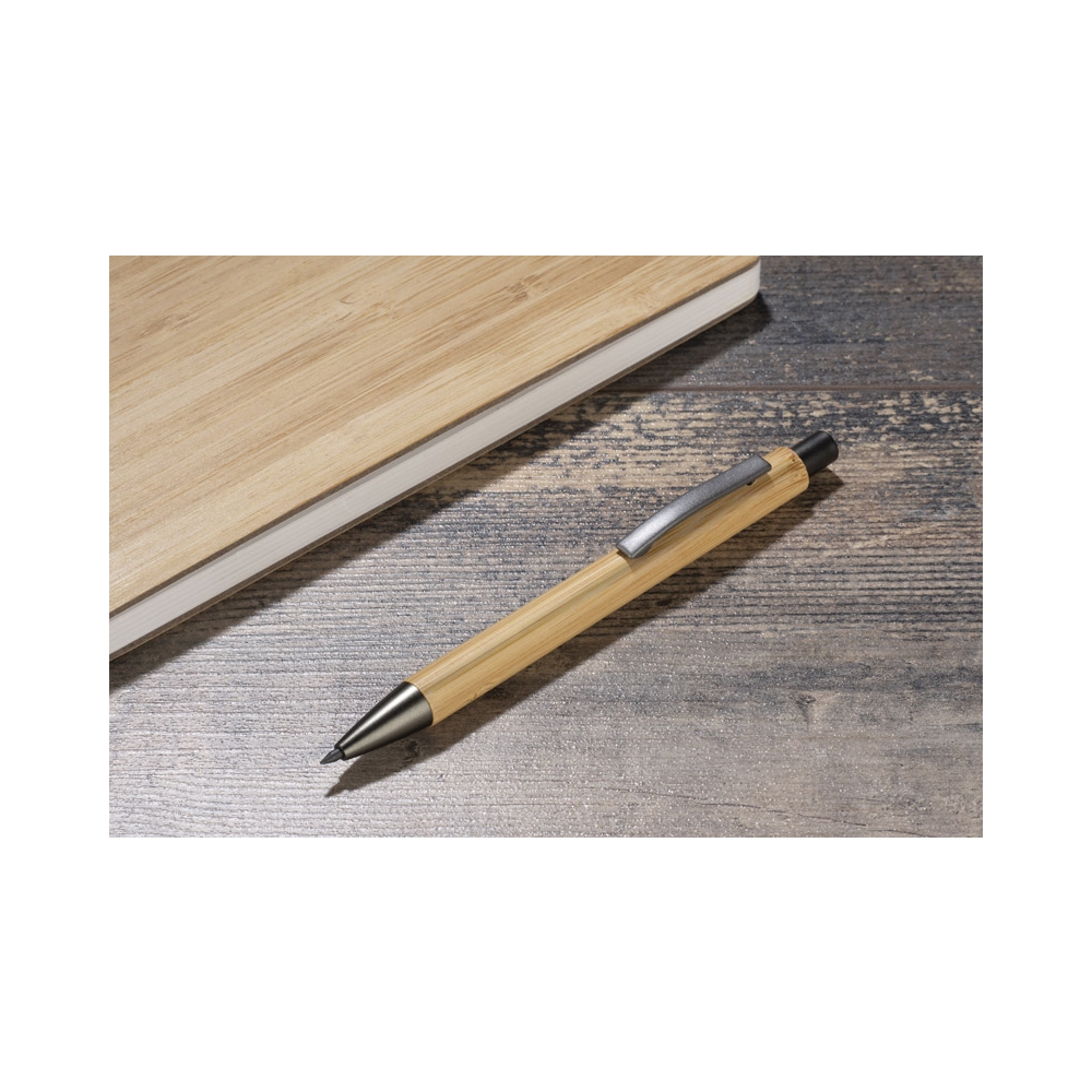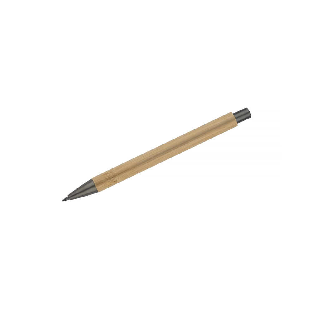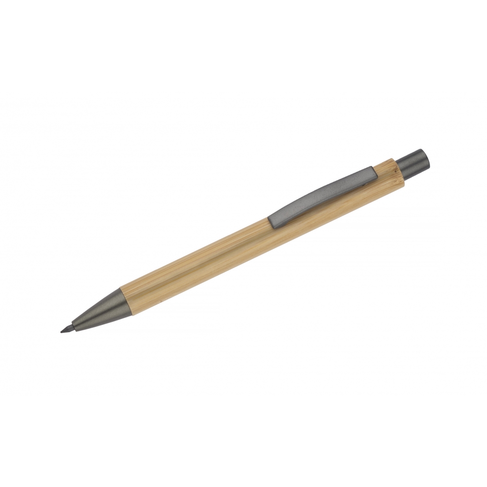 Artikel-Nr: ARD19693-17EVER ist ein Füllbleistift mit einem speziell gehärteten Griffel, der einen ähnlichen Schreibkomfort wie ein frisch angespitzter Bleistift bietet. Der Bleistift hat den gleichen Mechanismus wie ein Kugelschreiber. Der Körper ist aus Bambus mit graphitfarbenen Metallelementen gefertigt.