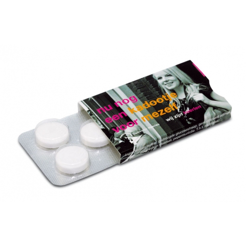 Artikel-Nr: 42816055 Pfefferminzstückchen in Blisterverpackung. Weißer Karton, 4c-Euroskala bedruckt. Format: 6,6 x 4,3 x 0,9 cm, Haltbarkeit: 24 Monate, Lieferzeit: ca. 2 Wochen, Ab 10.000 Stück sind Pfefferminzstücke auch mit eigenem Logo lieferbar. Preise inkl. 4-farbigen Druck, zzgl. Drucknebenkosten