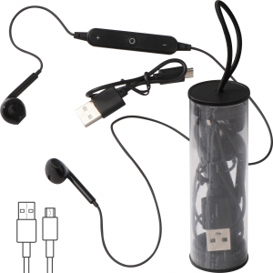 Artikel-Nr: EAG082203Bluetooth Kopfhörer mit Lautstärkeregulierung und USB-Ladekabel in einer Kunststoffverpackung mit Hängeschlaufe. Ihre Werbung wird auf die Verpackung gedruckt.