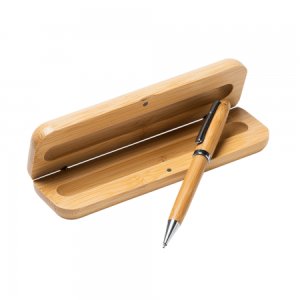 Artikel-Nr: PRM158105_20Drehkugelschreiber aus Bambus mit Edelstahldetails. Präsentation im Bambusbeutel mit Magnetverschluss. Blaue Tinte.