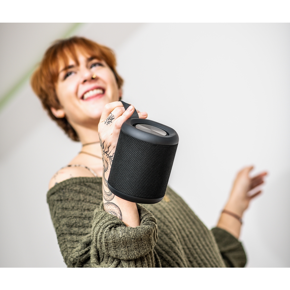 Artikel-Nr: NMT618Mein lieber Herr Gesangsverein, was für ein Klang! Druckvoller Bass und fein abgestimmte Höhen bringen Sie in Schwung! Input: DC 5V-2A Frequenzband: 2402-2480 MHz Batterie: 7.4V/2000 mAh x 2 Signal-Rausch-Verhältnis: 80 dB Frequenzgang: 90Hz -20kHz Nennleistung: 2 x 15W (RMS) Ladedauer: ca. 2 Stunden Spielzeit ca. 4-5 Stunden (max. Vol.) Material: ABS, schwarz Plastikfreie Einzelverpackung Maße: 130 x Ø 105 mm Gewicht ohne Verpackung: 770 g Werbeanbringung: Auf die seitliche runde Platte Ø 35 mm (L2) Dieses Produkt unterstützt aktiv den Ausgleich der entstehenden CO2-Emissionen durch zertifizierte Klimaschutzprojekte.
