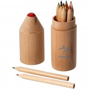 12 Farbstifte in zylinderförmigem Stiftebox aus Holz.