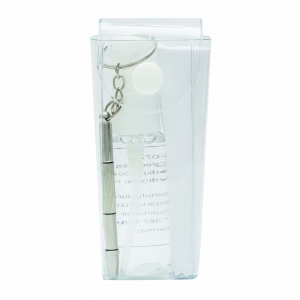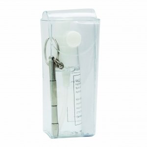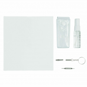 Artikel-Nr: INP56-0407710Brillen-Reinigungsset VIEW: Sprühfläschchen mit Reinigungsflüssigkeit (ca. 20 ml), Brillenputztuch, Mini-Schraubendreher mit Schlüsselring, in PVC-Hülle mit Druckknopfverschluss