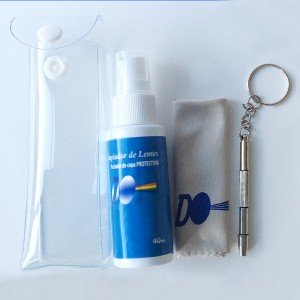 Mit 40 ml Reinigungsspray, Mini-Schraubendreher mit Schlüsselring und Brillenputztuch in einer PVC-Hülle. Das Brillenputztuch kann vollfarbig bedruckt werden. Größe des Tuches: ca. 15 x 18 cm